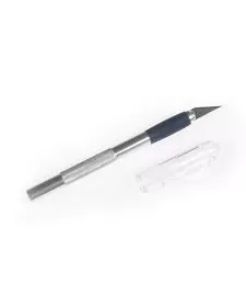 Sturdy, ergonomic scalpel with aluminum handle and comfortable rubber sleeve for a safe grip for fine cutting work.